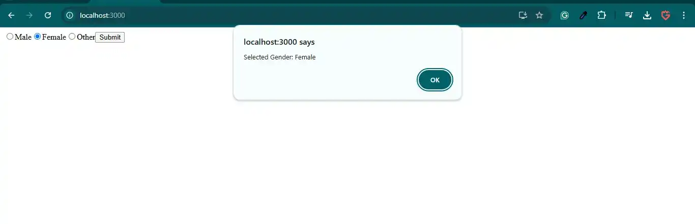 export default GenderRadioButton;In the above code example, I have used the checked={gender === 'Male'} to create gender radio button in react js.