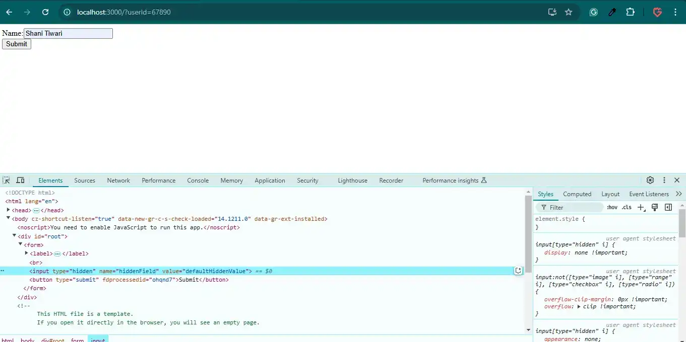 export default App;In the above code example, I have used the type="hidden" to create hidden field in react js.