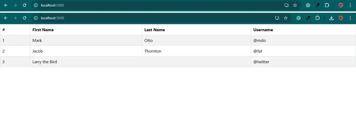 export default App;In the above code example, I have used the <Table> to use bootstrap table in react js.